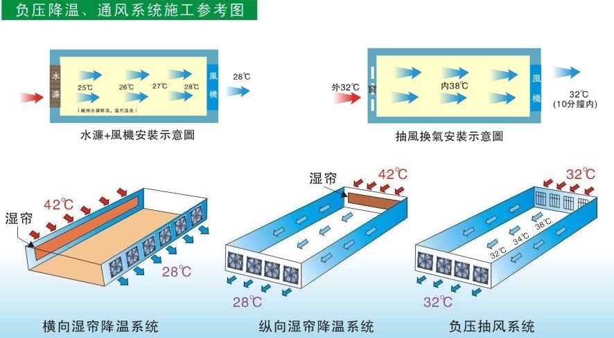 厂等可根据其不同的环境设计相应的水帘降温系统而且又随室内的具体情况调节不同的风速、风量非常灵活。