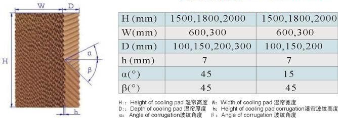 4、按波纹夹角可分为45度+45度、30度+60度、45度+15度,水帘纸的型号有5090、5060、7090、6090、7060、9090、9060。降温水帘常用的型号是7090,根据不同需要也可以制