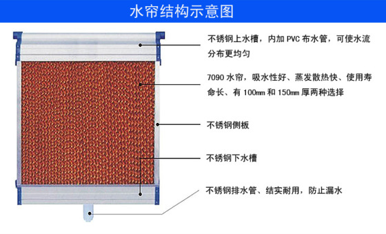 水帘主要由高分子水帘纸组成,湿纸帘是一种特殊的产品,经过特殊处理,结构强度高,耐腐蚀,使用周期达六年以上。我们可以从水帘纸的透光性中看出较低的阻力与透气性这说明水帘纸具有优良的透气与湿水性,可以保证水均匀的淋透整个水帘墙,水帘是纸的立体空间设计为水和空气的热交换提供了蒸发的最大表面积,高耐水性能又具有较大的蒸发比,水帘的外框有铝合金或者镀锌板做成,选择这两种材料的目的是防止生锈,外框的结构是经过精心设计的,上边框里面有安装进水管的卡槽,进水管可以固定在上边框的里面,进水口在中间,水从进水口流入之后经过进水管均匀的向整个纸帘分散,安装外边框的时候先在上边框中放置一排横向的纸帘,这些横向的纸帘起着分水的作用,保证整个纸帘均匀的向下渗水,再把已经准备好的水帘纸并列排起来放进接好的框架中,把已经拼接好的水帘纸竖放起来然后在水帘的四边钻孔同时用气钉固定,这样一个水帘就制作完成了。