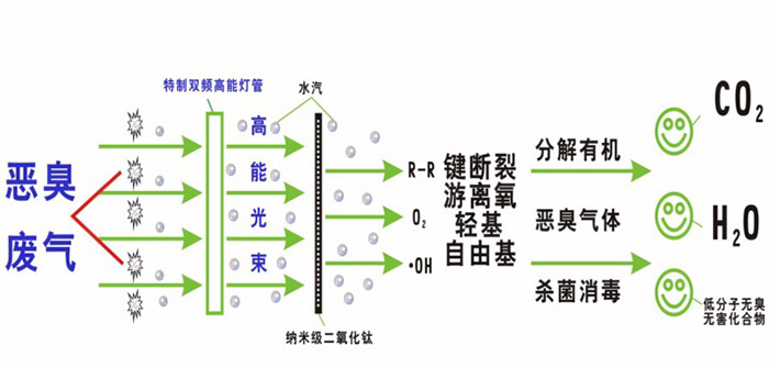 苯的分子链结构,使有机或无机高分子恶臭化合物分子链,在高能紫外线光束照射下,降解转变成低分子化合物,如CO2、H2O等。