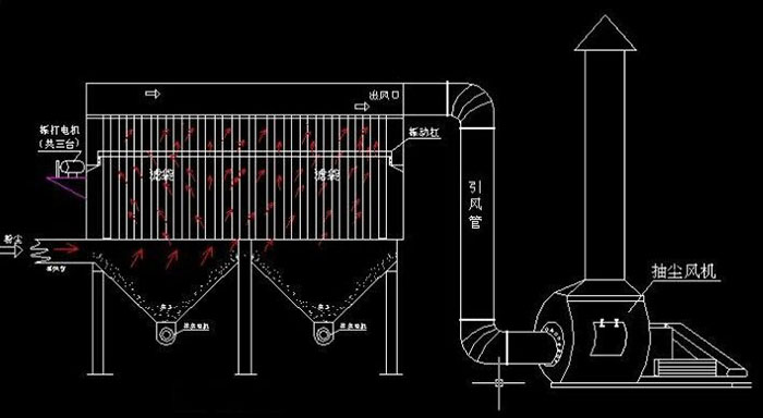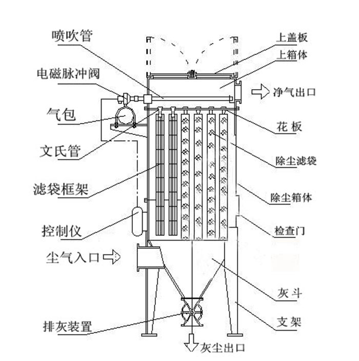 含尘气体由灰斗上部进风口进入后,在挡风板的作用下,气流向上流动,流降低,部分大颗粒粉尘由于惯性作用被分离出来落灰灰斗,含尘气体进入中箱体滤袋的过滤净化,粉尘被阻留在滤袋的外表面,净化后的气体经滤袋口进入上体箱,由出风口排出。