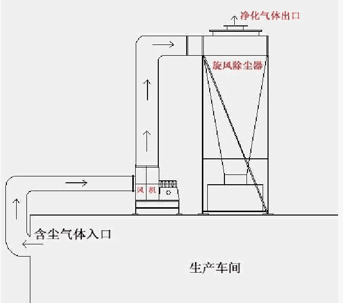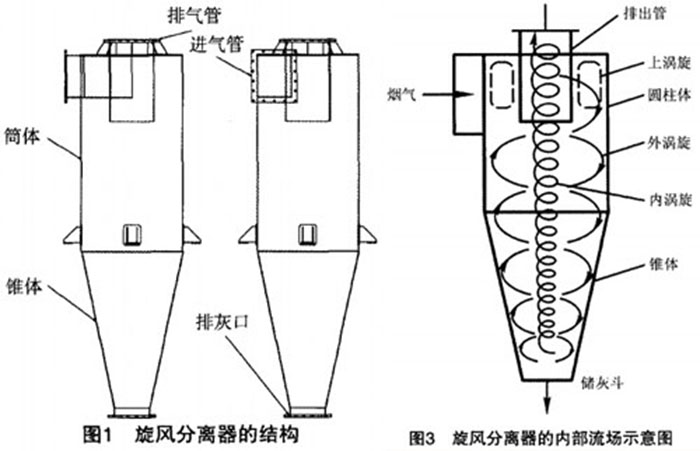 含尘气流由进口沿切线方向进入除尘器后,沿器壁由上而下作旋转运动,这股旋转向下的气流称为外涡旋(外涡流),外涡旋到达锥体底部转而沿轴心向上旋转,最后经排出管排出。这股向上旋转的气流称为内涡旋(内涡流)。外涡旋和内涡旋的旋转方向相同,含尘气流作旋转运动时,尘粒在惯性离心力推动下移向外壁,到达外壁的尘粒在气流和重力共同作用下沿壁面落入灰斗实现净化。气流从除尘器顶部向下高速旋转时,顶部压力下降,一部分气流会带着细尘粒沿外壁面旋转向上,到达顶部后,在沿排出管旋转向上从排出管排出,这股旋转向上的气流称为上涡旋(上涡流)。