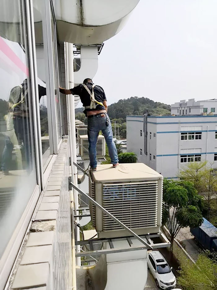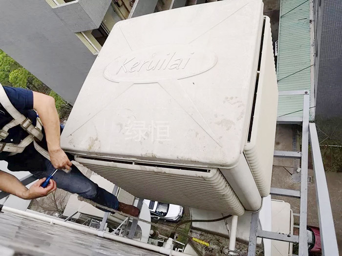 警告:清洗机组时必须停机并关闭电源,否则会发生触电危险或机组对人体的其它伤害;因环保空调保养涉及高空作业,保养时必须由专业的安装或维修人员操作,在外墙作业时必须系好安全带,做好安全防范措施才可以作业!