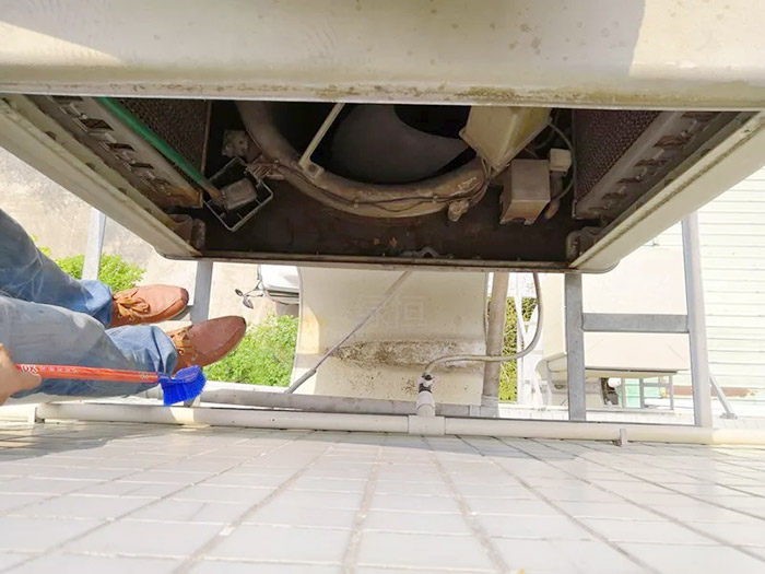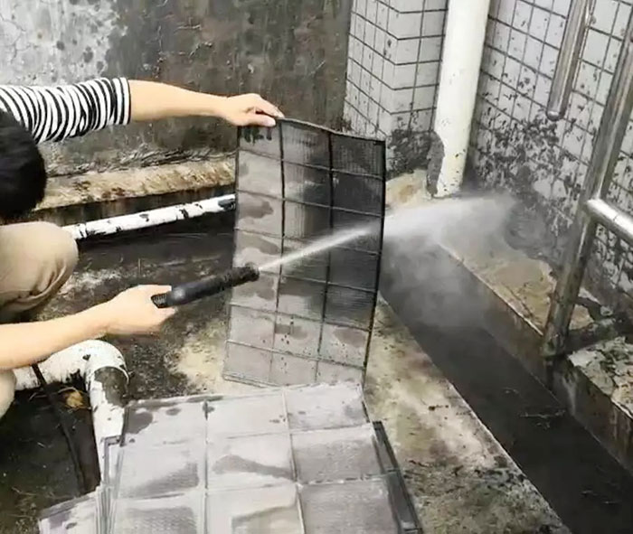 3、将过滤网取下拿到地面,用高压水枪冲洗干净后装回主机。